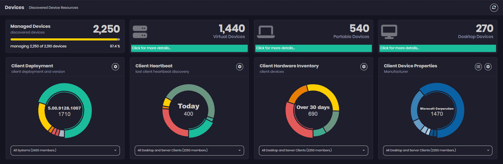 The top row of statistics gives you quick access to Managed Devices (Devices with a Configuration Manager client), Virtual Devices, Portable Devices and Desktop Devices.