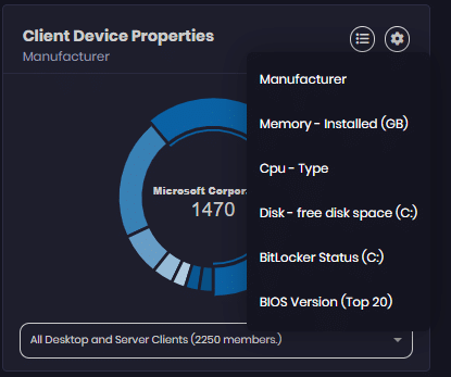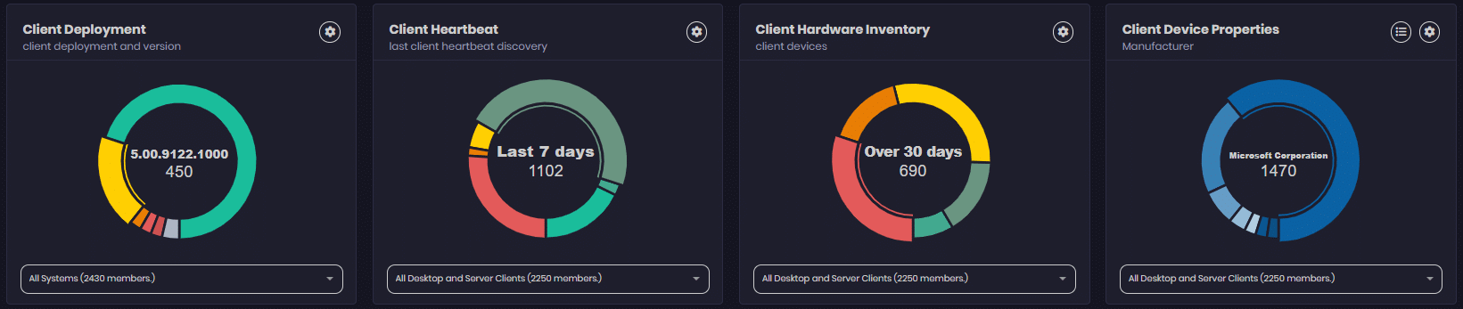 The next row of statistics are doughnut charts, which show you information about your Configuration Manager client count, Client Heartbeat, Client Hardware Inventory and Client Device Properties.