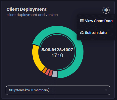 In this Donut chart you can see all the different versions of Configuration Manager clients you managing in your environment. This is a handy stat to see after a Configuration Manager upgrade to see. When you click on the cog in the top right you will have an option to View Chart Data or refresh data.