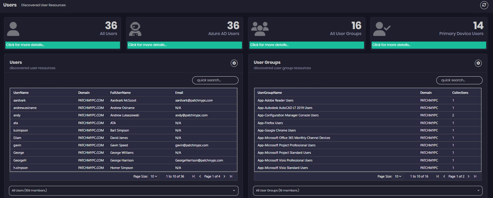 The top row of the data gives you a quick overview of the number of Active Directory Users, Azure AD Users, All Active Directory User Groups and Primary Device Users.