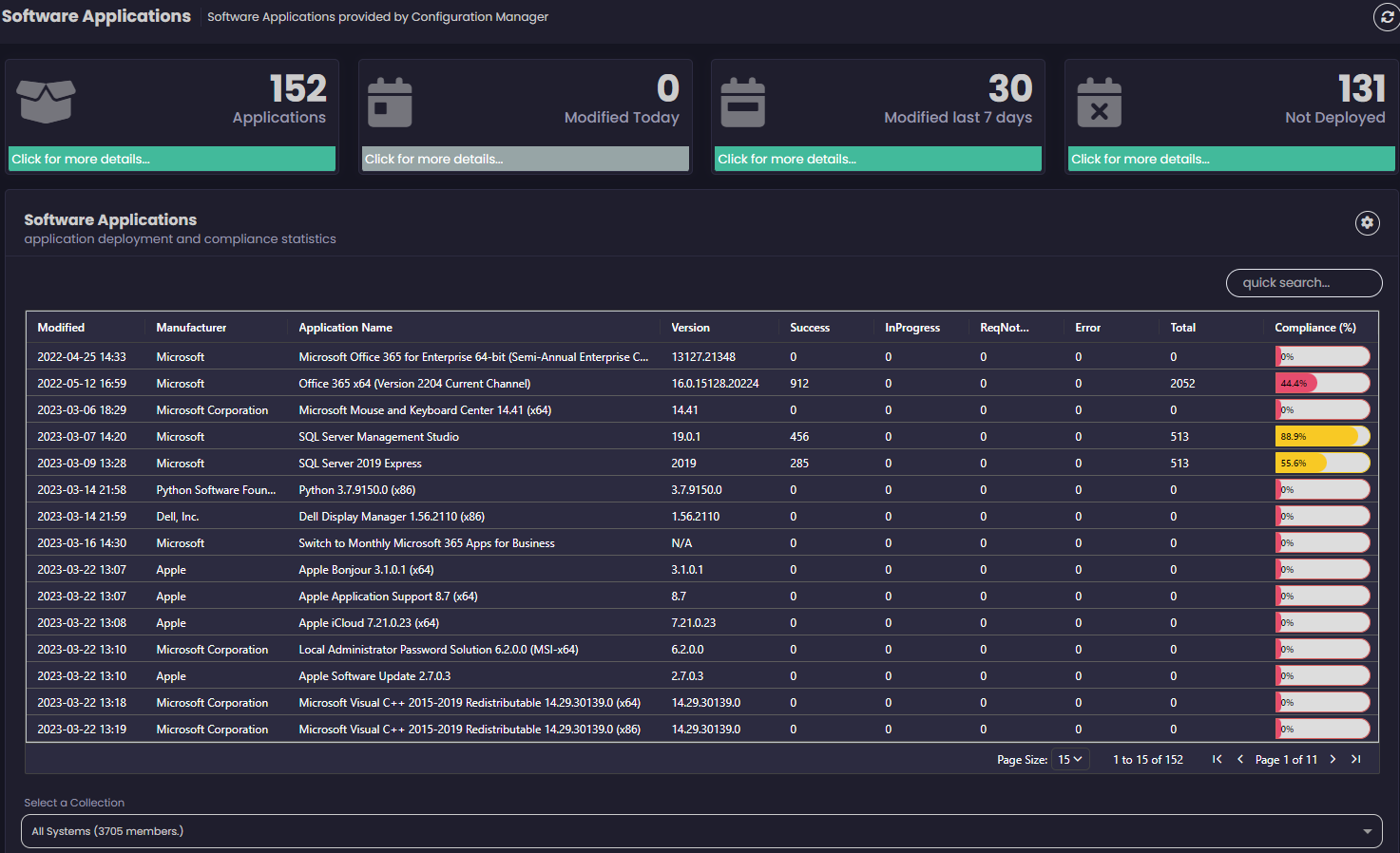 This dashboard shows details for all Applications defined in the Configuration Manager console.