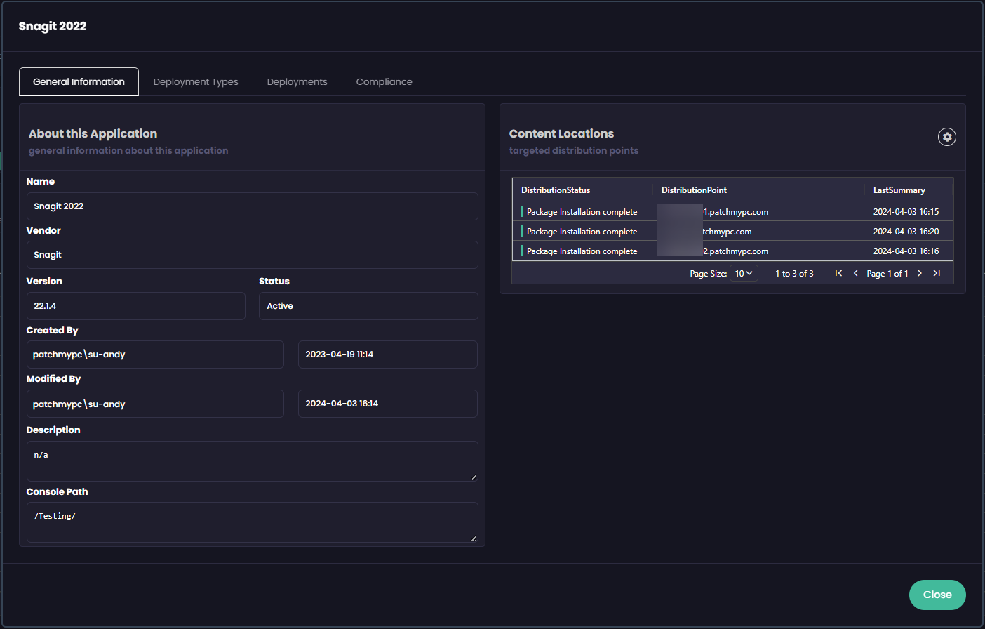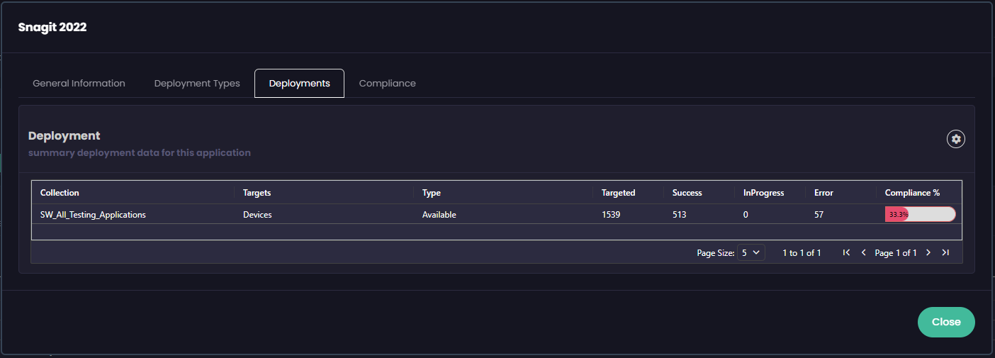 Click through to any individual application shows additional detail, including individual deployment compliance: