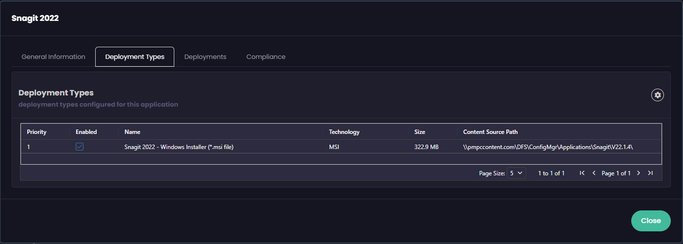 The Deployment Types tab lists all deployment types defined for the application, the relevant technology and content size with the source path.