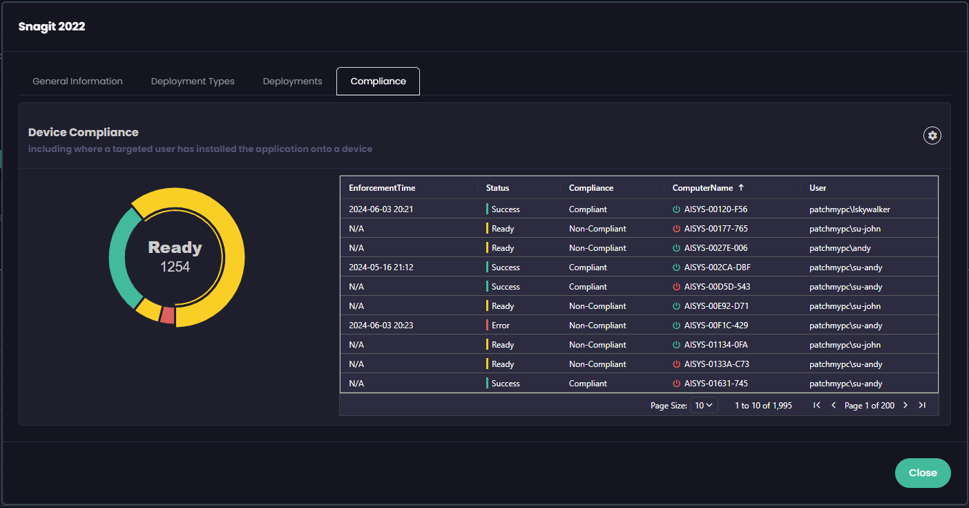 The compliance tab lists each targeted client and its overall application deployment compliance. Clicking any individual machine will take you to the device view focused on the software – applications tab.