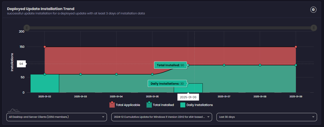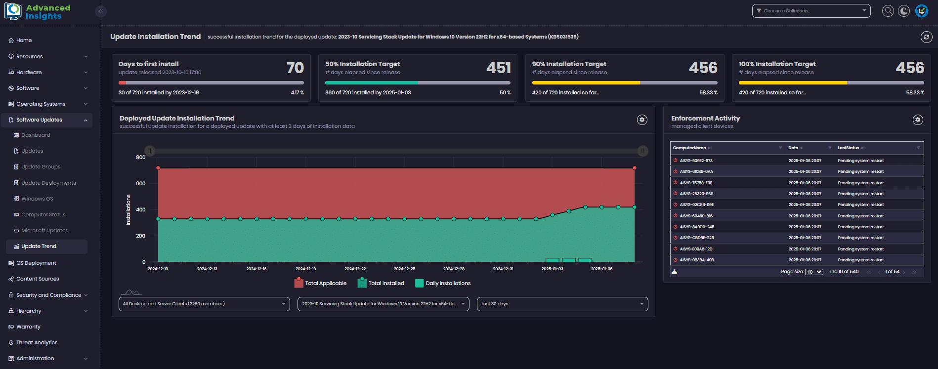 The Update Installation Trend dashboard shows the deployment trend of installation of a update.