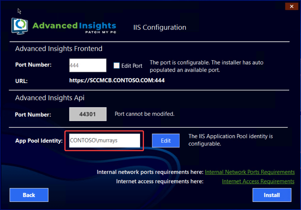 In this example, the installer automatically determined that the best available port was 444. IIS Application Pool left as default ‘LocalSystem’.