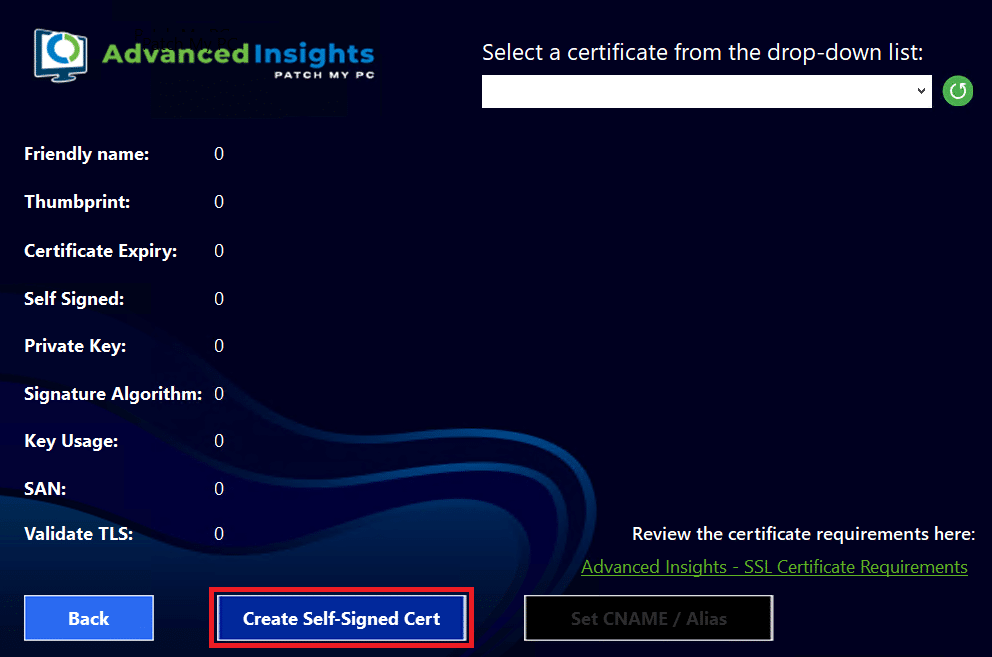 To deploy Advanced Insights using a self-signed certificate, on the certificate selection page, click the ‘Create Self -Signed Cert’ button: