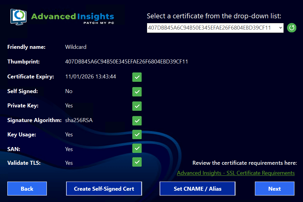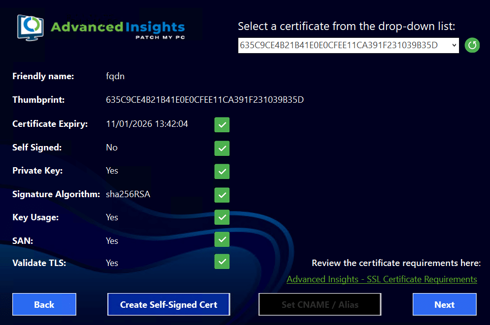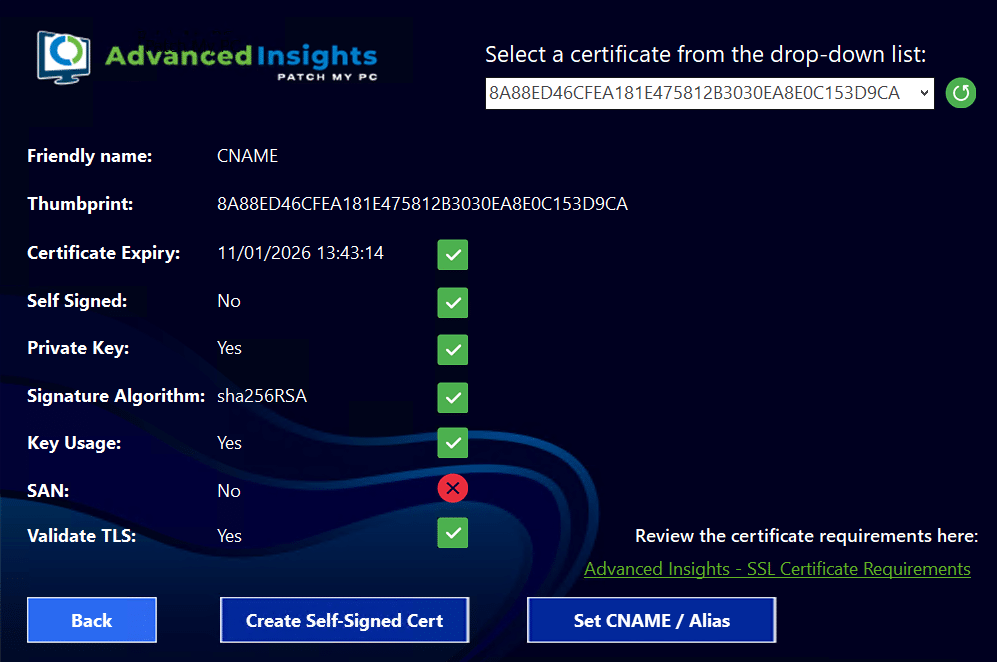 Ensure the SSL certificate requirements are reviewed here: [insights-certificate-requirements.md](../advanced-and-patch-insights-requirements-and-prerequisites/insights-certificate-requirements.md “mention”)