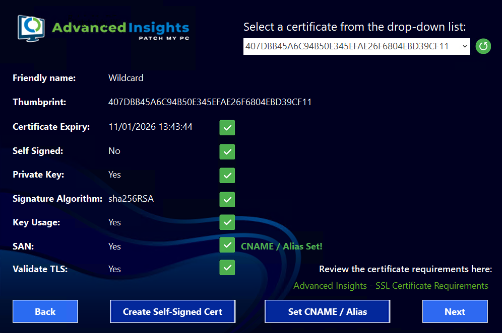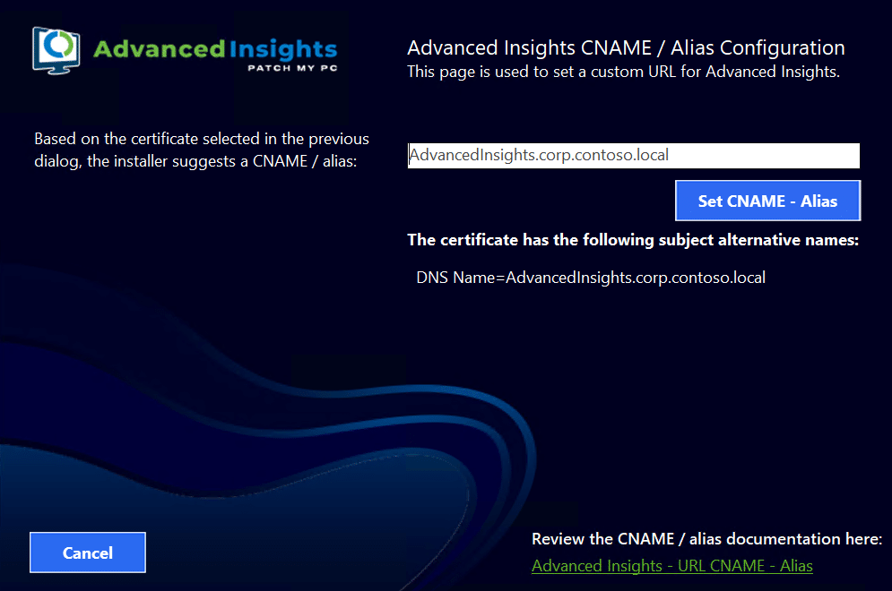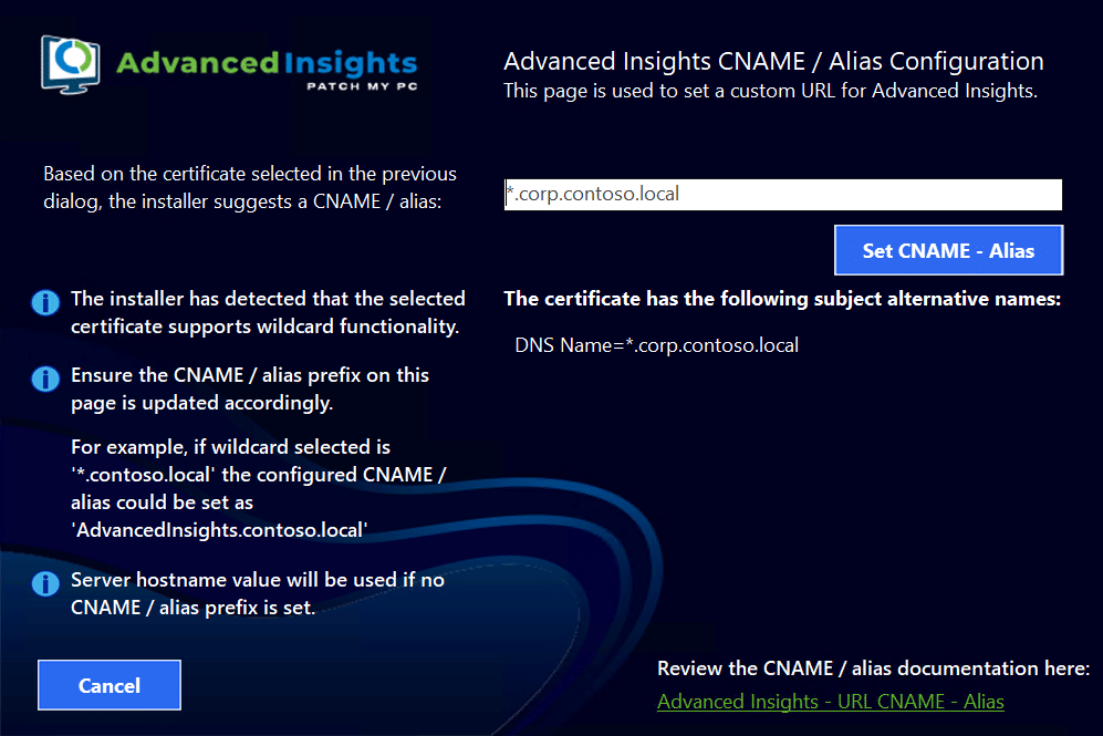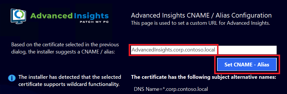 When using a wildcard certificate, if no CNAME / Alias is set using the CNAME / Alias configuration page, the installer will automatically default to setting the Advanced Insights URL to the server host name FQDN.