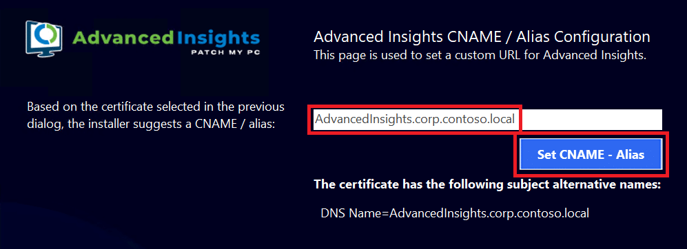 - For custom Advanced Insights URL deployment using a CNAME / Alias, (e.g. https://AdvancedInsights.contoso.local) follow steps described in section: #cname-alias-certificate