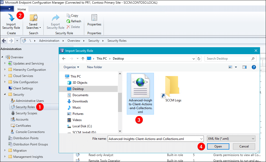 To import the security role XML file, open the ConfigMgr console and navigate to Administration > Security > Security Roles > click Import Security Role.