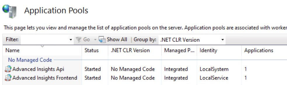By default, the IIS App Pools run under the local computer account of your Advanced Insights Server.