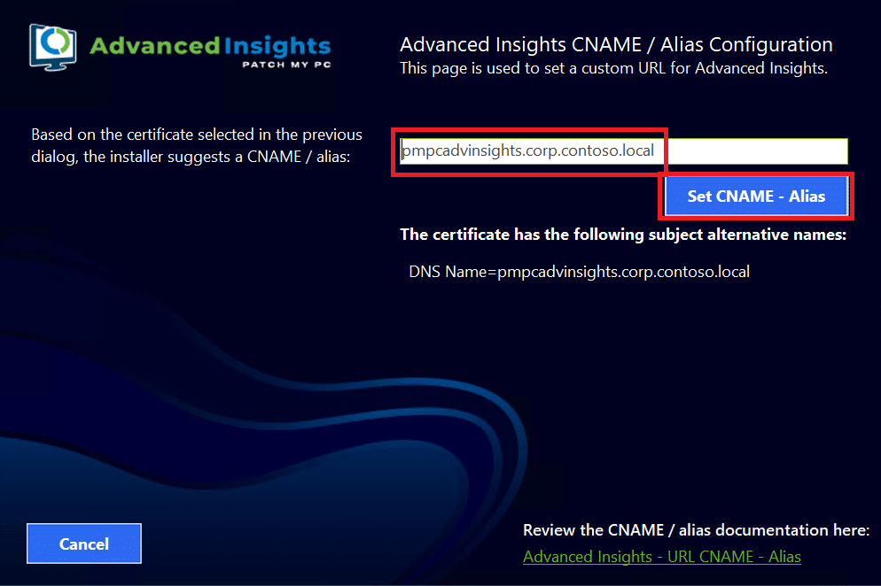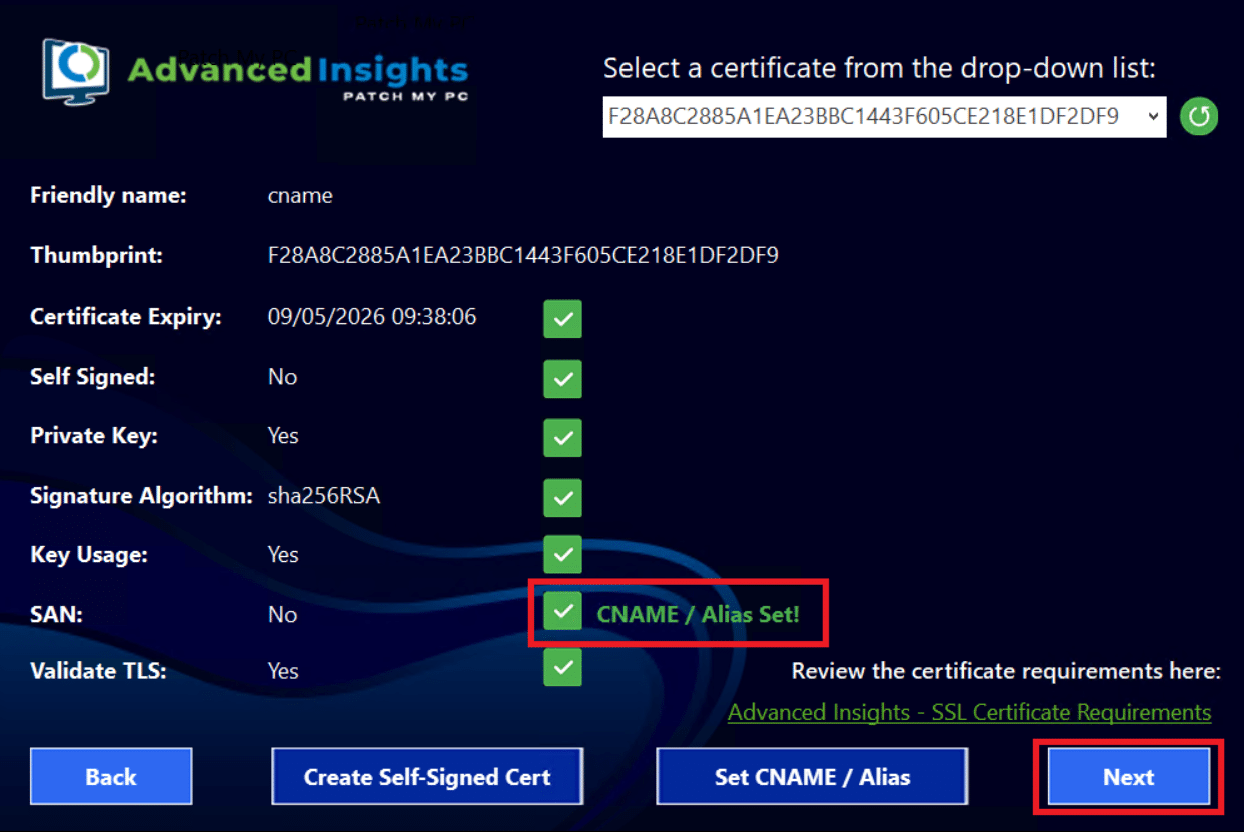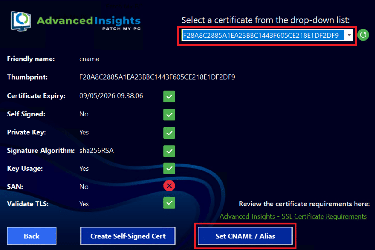 In the set CNAME / Alias dialog page, the dialog will be prepopulated with a value for the CNAME / Alias based upon the selected certificated.