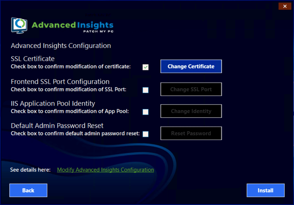This section describes the steps required to change the SSL certificate used for an existing Advanced Insights deployment.