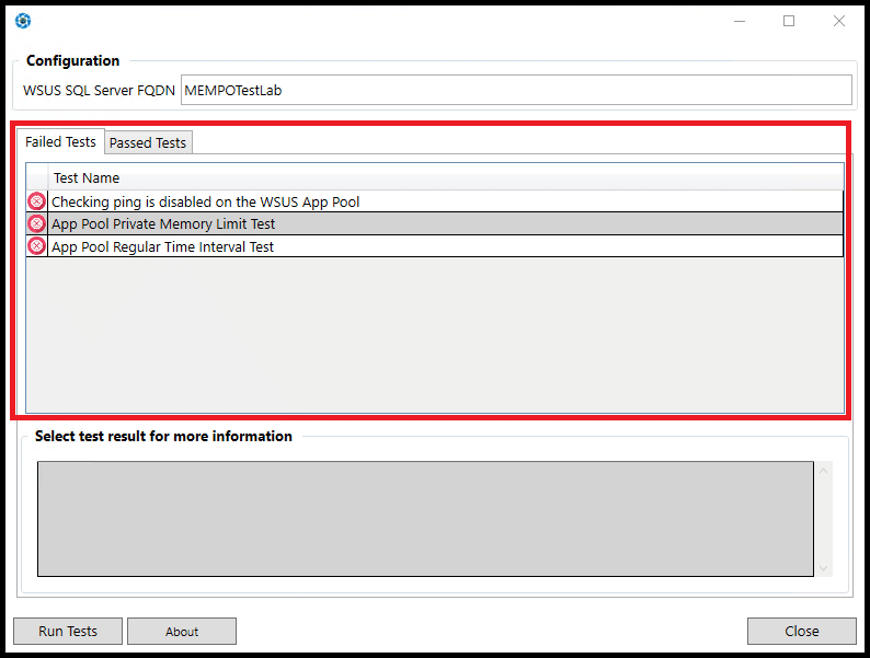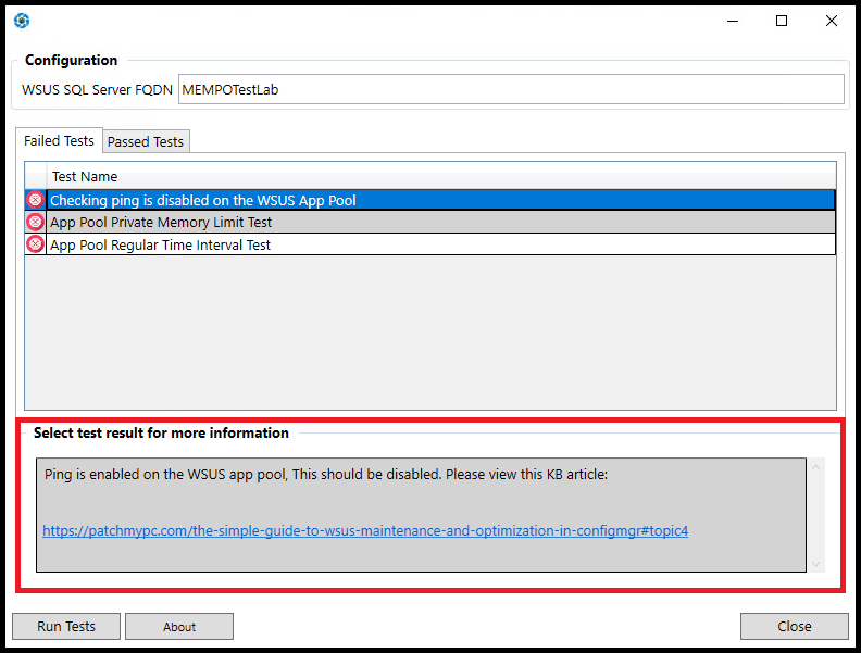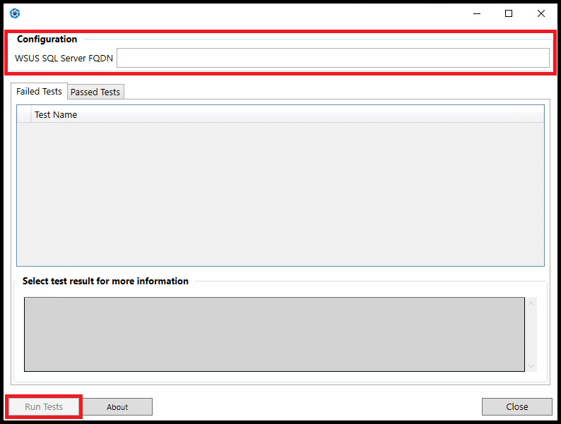 Before we can run any tests, you will need to enter your ConfigMgr SQL Server FQDN and then click Run Tests