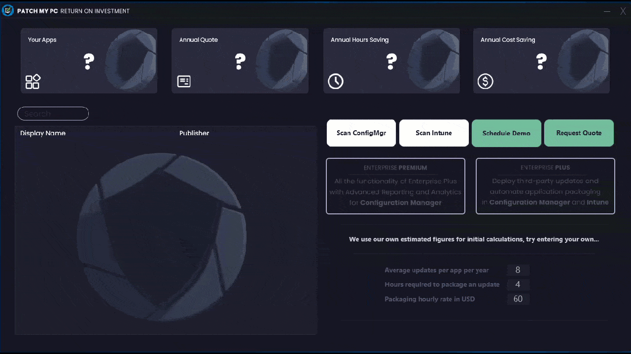 The Annual Hours and Annual Cost savings tiles show an estimate of the impact of using Patch My PC to handle your application updates over a manual approach. The parameters used to create these estimates can be edited in the bottom right section of the tool to reflect your cost and experience.
