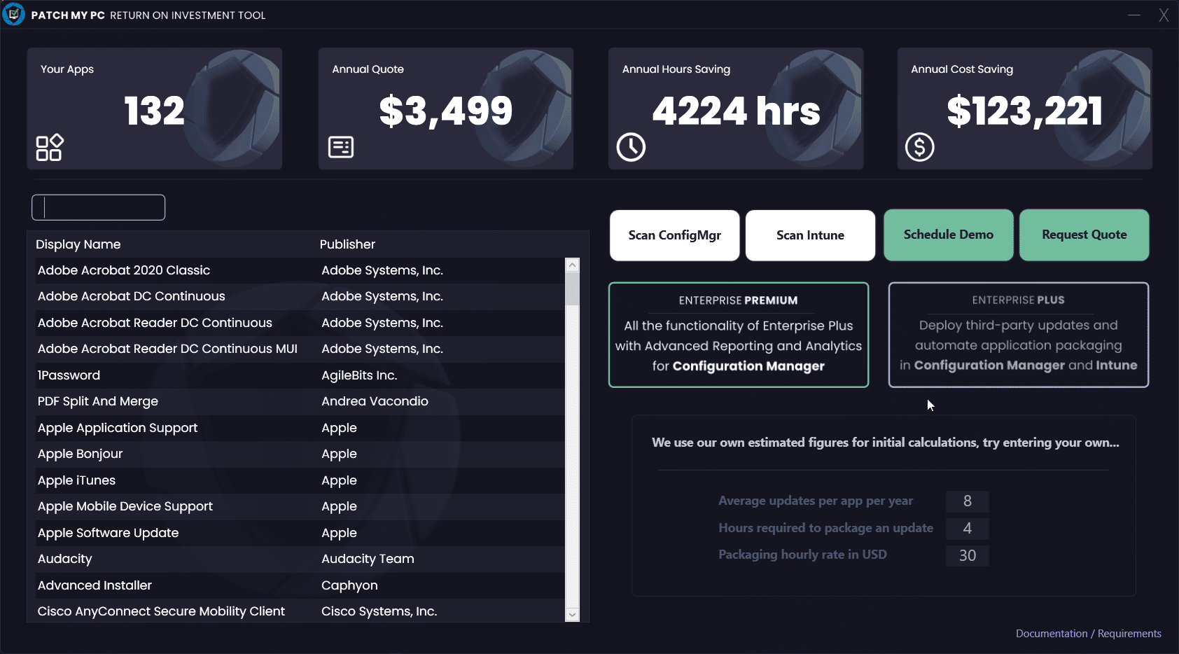 The Patch My PC Return on Investment (ROI) tool helps identify the products supported in the current Patch My PC catalog that are in use in your environment.
