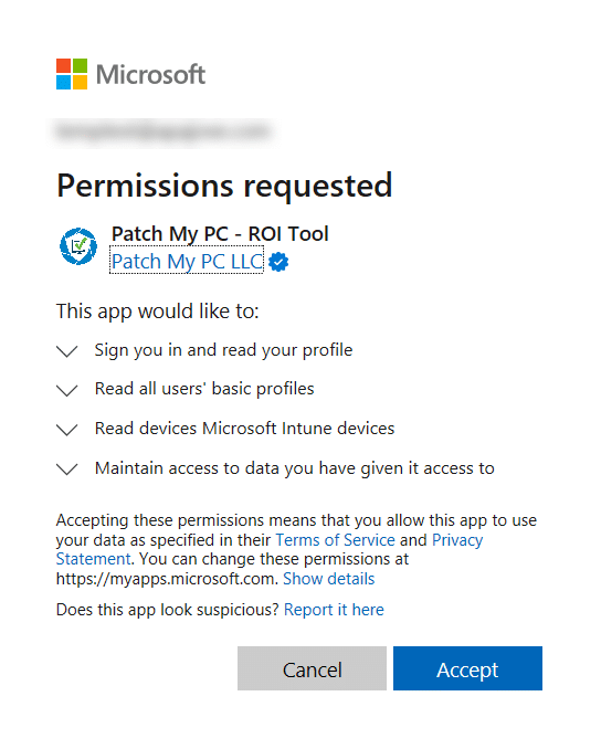 This uses delegated permissions; the Patch My PC ROI tool does not harvest any of your Intune data, and it is not stored anywhere other than in your tenant. It simply allows the tool to connect to your Intune tenant on your behalf.