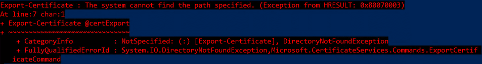 If you receive the message “The system cannot find the path specified” (as shown below), please ensure the credentials used to launch the PowerShell session have permission to create a folder at C:temp or specify a new path for the $certFolder variable where you do have permission to create the folder.