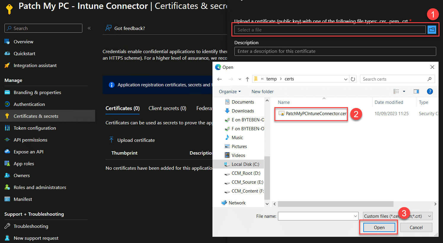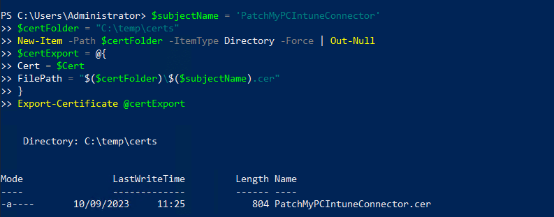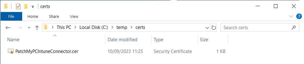 We need to export the Public Key and upload it to the new app registration for the Patch My PC Intune connector. Follow the steps below:-