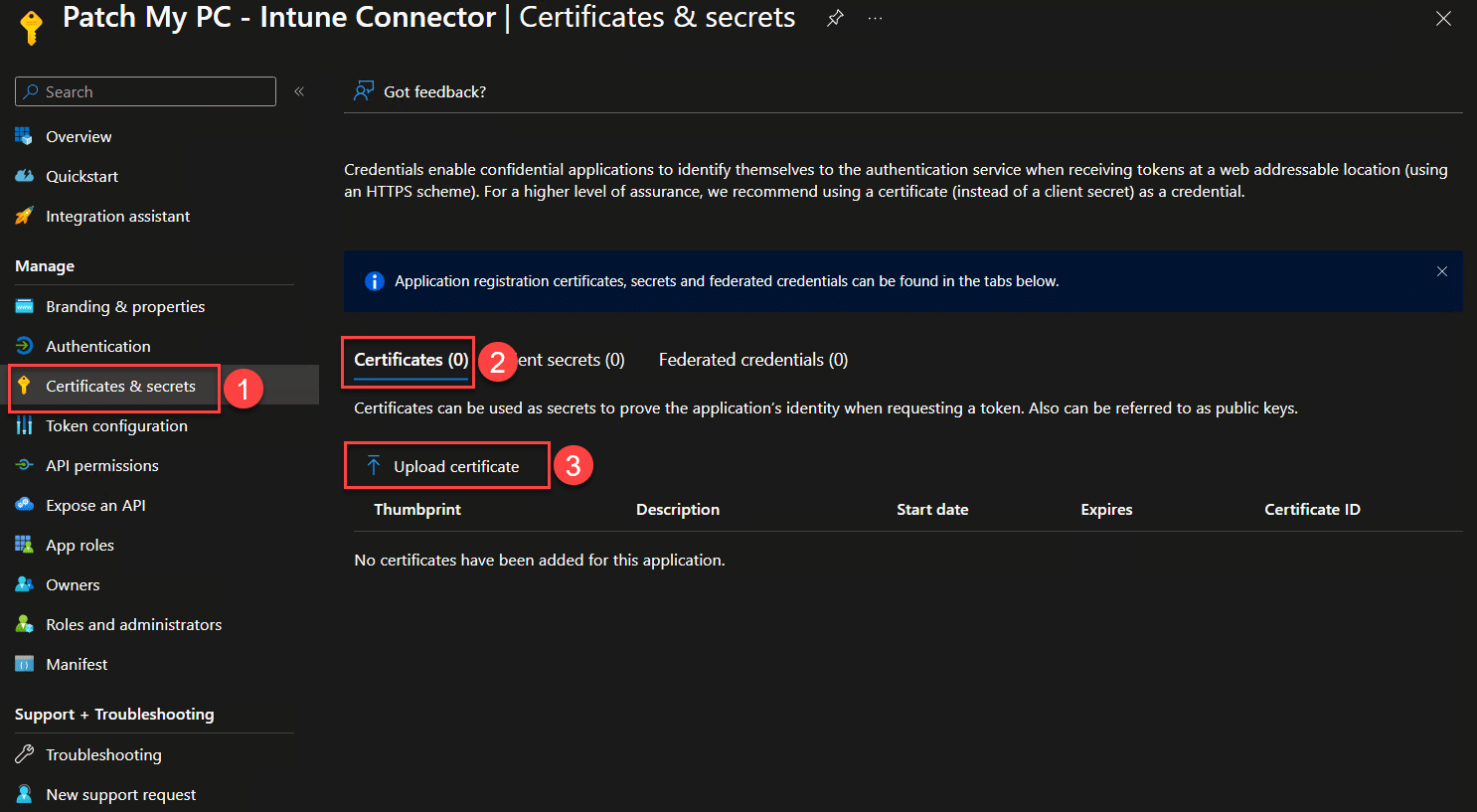 In the browser, navigate to the App registration created in Step 1 and select the Certificates & secrets node in the left column. Select the Certificates and click Upload certificate.