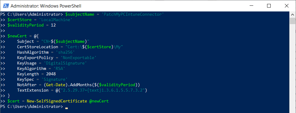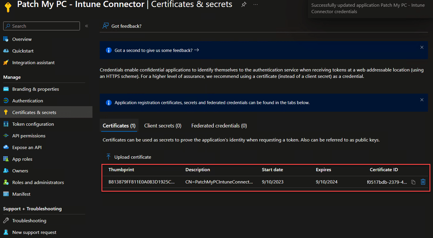 Certificate-based authentication is the preferred authentication method when connecting to an Azure App Registration. This document will focus on creating a self-signed certificates for use with the Patch My PC Publisher: Create a self-signed public certificate to authenticate your application.