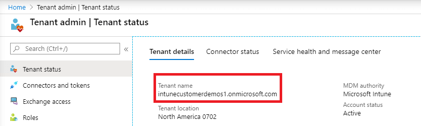 If you do not know your Intune tenant domain, navigate to the tenant status page in your Intune tenant, and look at the property for Tenant name.