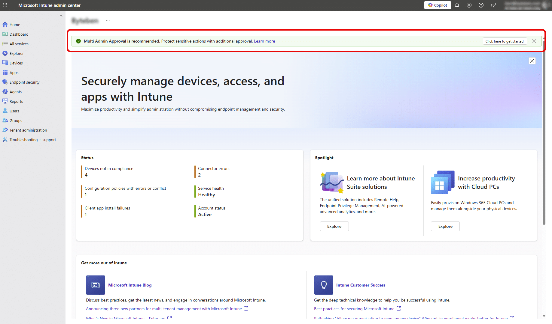 Microsoft has recently started displaying a MAA banner in the Intune admin center. This is an informational prompt encouraging tenants to consider enabling MAA for additional governance.