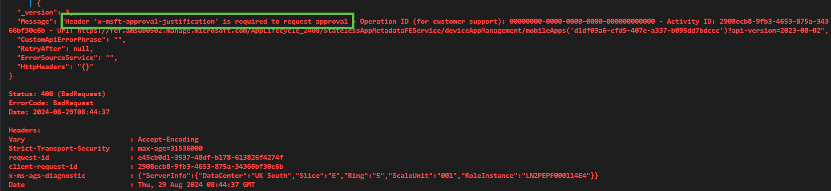 Here is another example of a response when using a delegated authentication flow to make changes to a Win32 app when a MAA access policy has been created.