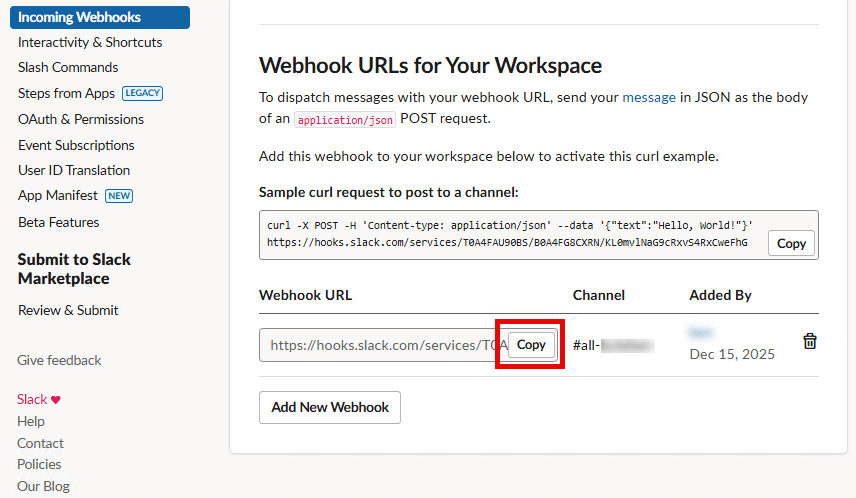 4. Replace the existing Webhook URL with the one obtained by completing Step 1 above.