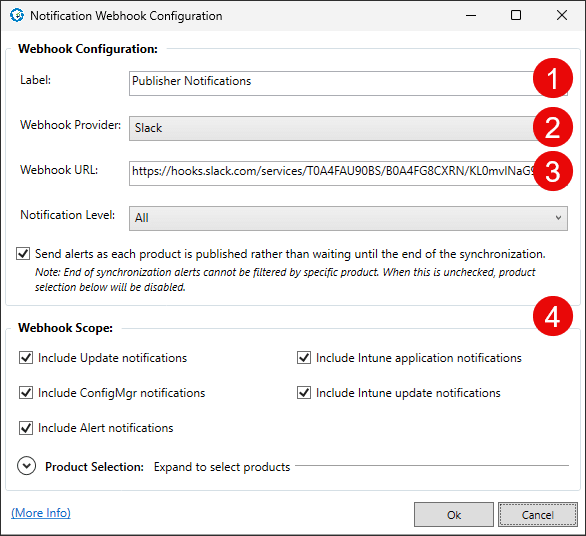 You can choose the notification level in the Notification Webhook Configuration window. The levels include receiving All, Error, or Success. This option can be helpful if you want a specific channel to only receive alerts if an update or application fails to publish.