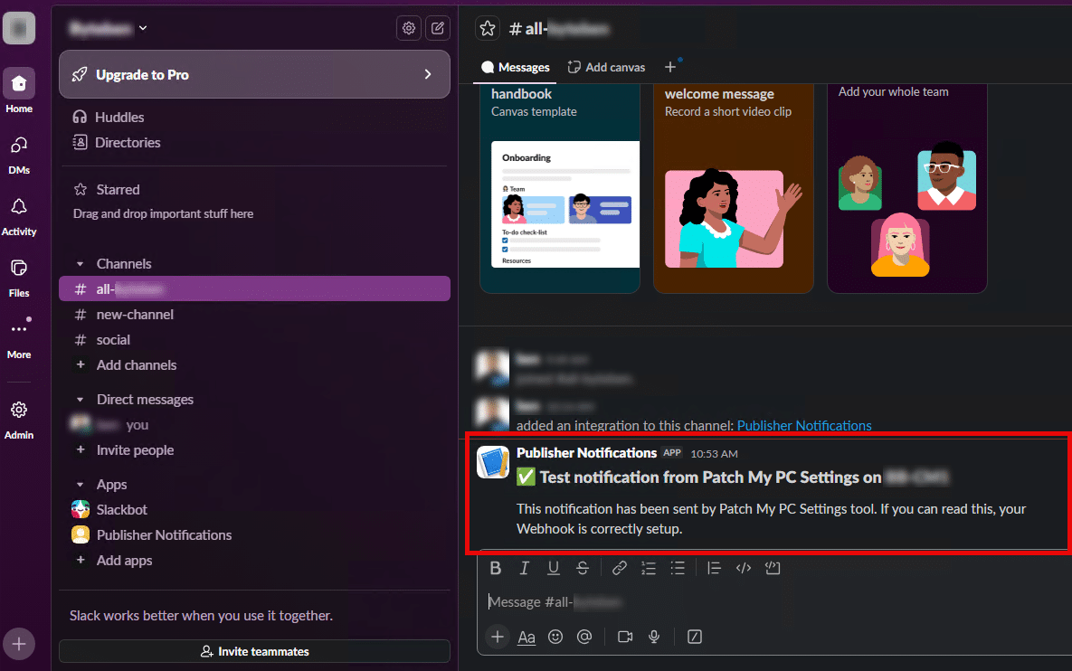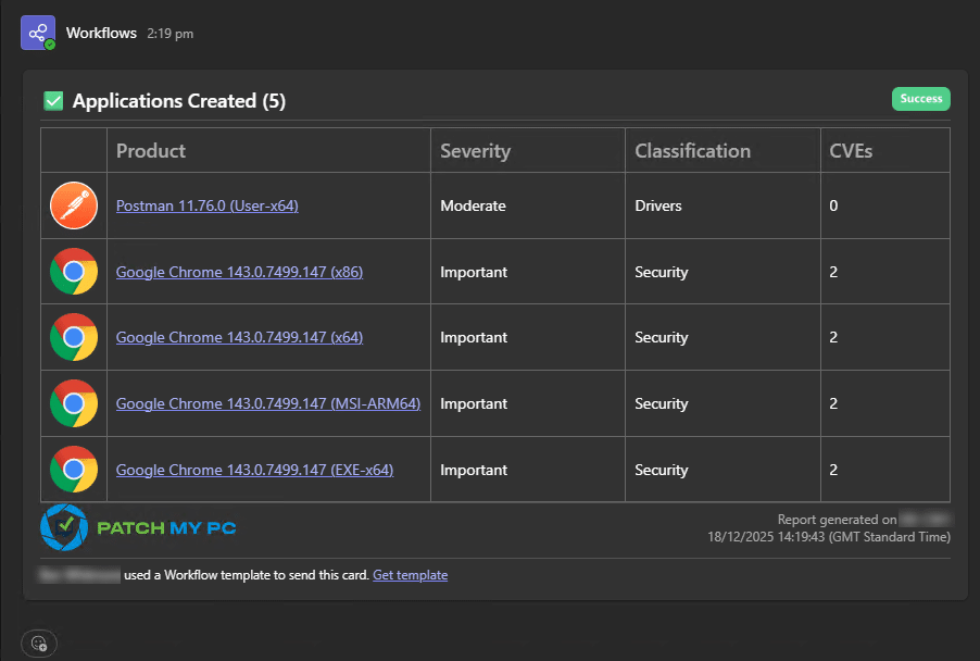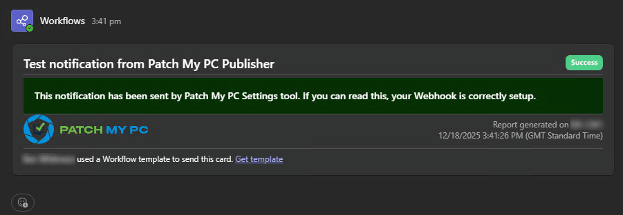 The account being used to create the Teams Workflow must be a member of the Team > Channel where you want the Patch My PC notifications to appear. The notification will include the name of the person who created the Teams Workflow. You cannot omit the name from the notification. This is by design from Microsoft.