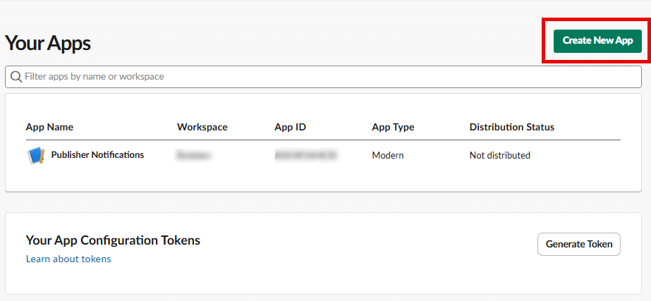 1. On the following web page https://api.slack.com/apps, select Create an app or Create New App if you have already configured apps previously. You will need to be logged into your Slack account and, depending on your settings, you may need to be a Workspace Owner of the account.
