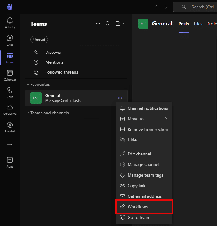 1. Open Microsoft Teams and navigate to the Channel where you want to receive Webhook Notifications. 2. Click the More Options button … and select Workflows.