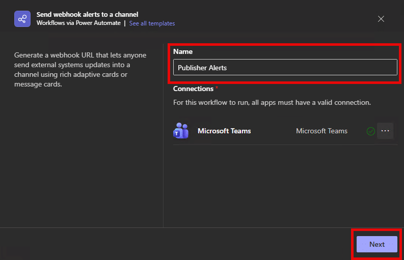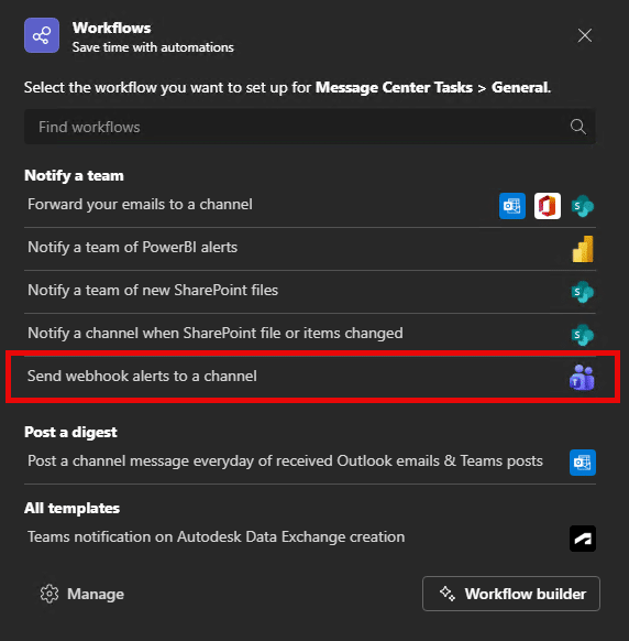 Before you can send Microsoft Teams alerts, you need to create a Microsoft Teams Workflow to obtain a valid webhook URL.
