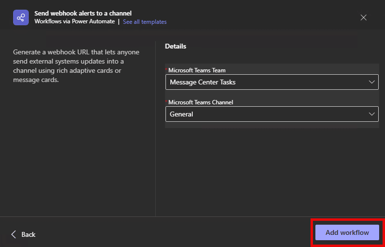 5. Allow a moment for the details tab to load to verify which Team and Channel the webhook URL will be created for and click Add workflow.