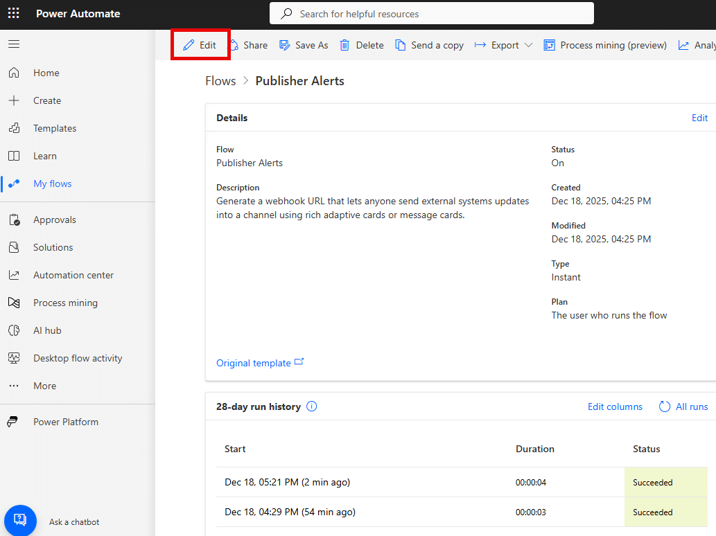 1. Navigate to https://make.powerautonmate.com 2. Find the Workflow used for Teams notification in the Private Channel and click Edit.