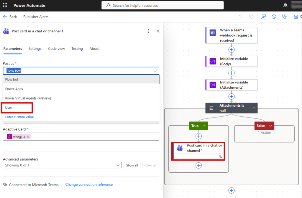 3. Select the step in the flow chart named Post card in a chat or channel. 4. Modify the Post As value and change it from Bot to User.
