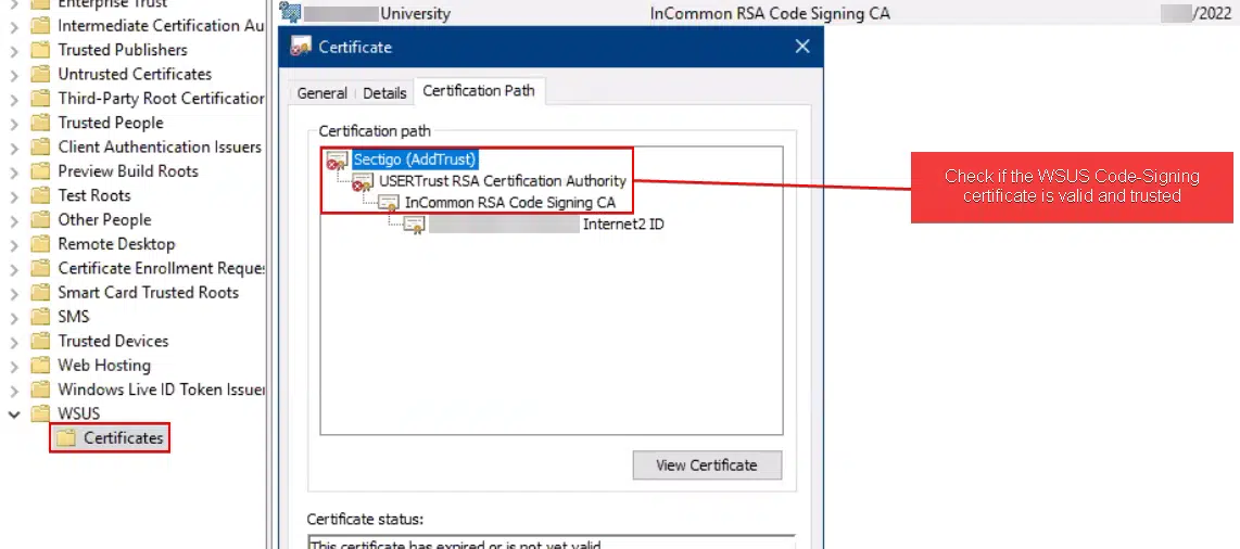 We have worked with customers using a WSUS code-signing certificate issued from Sectigo. There’s a known issue where if you don’t have the latest Sectigo Root CA and Code Signing certificates imported, you will receive this error after May 30, 2020.