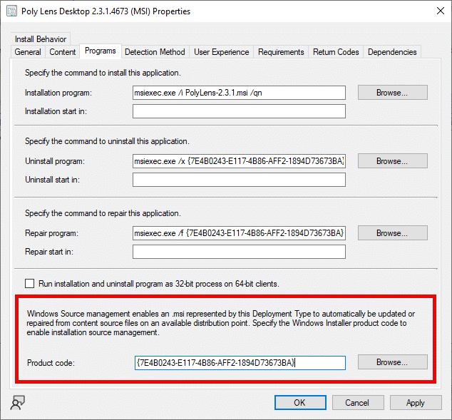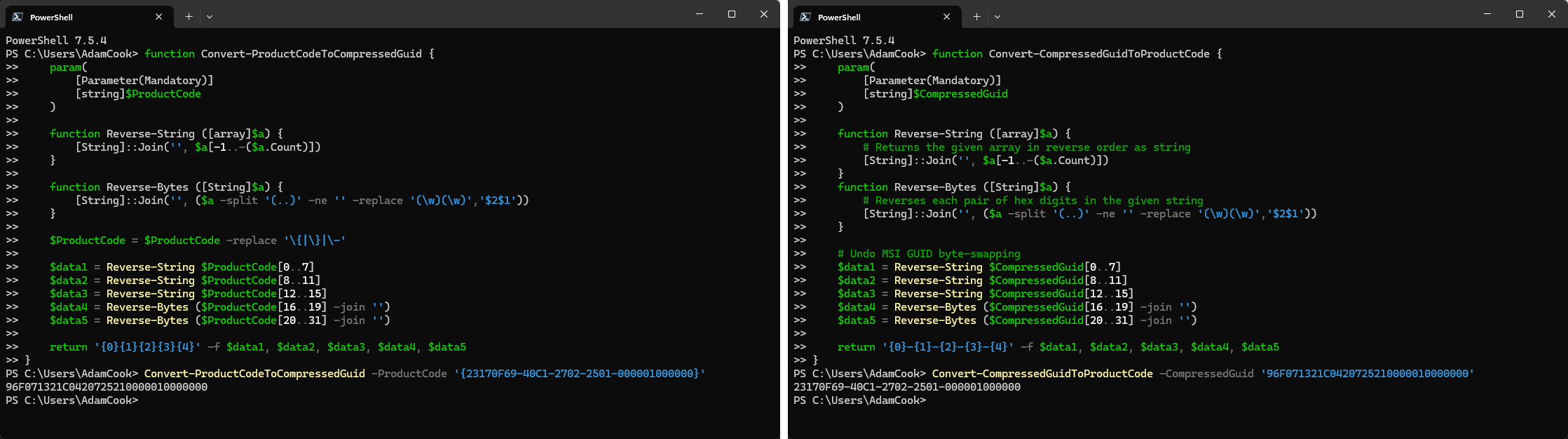 Note: To convert a compressed GUID to an MSI product code, or vice versa, see these PowerShell examples: