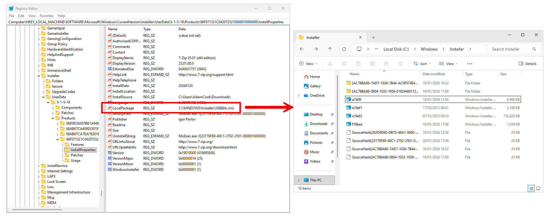 LocalPackagevalue contains the full path to the cached MSI inC:\Windows\Installer