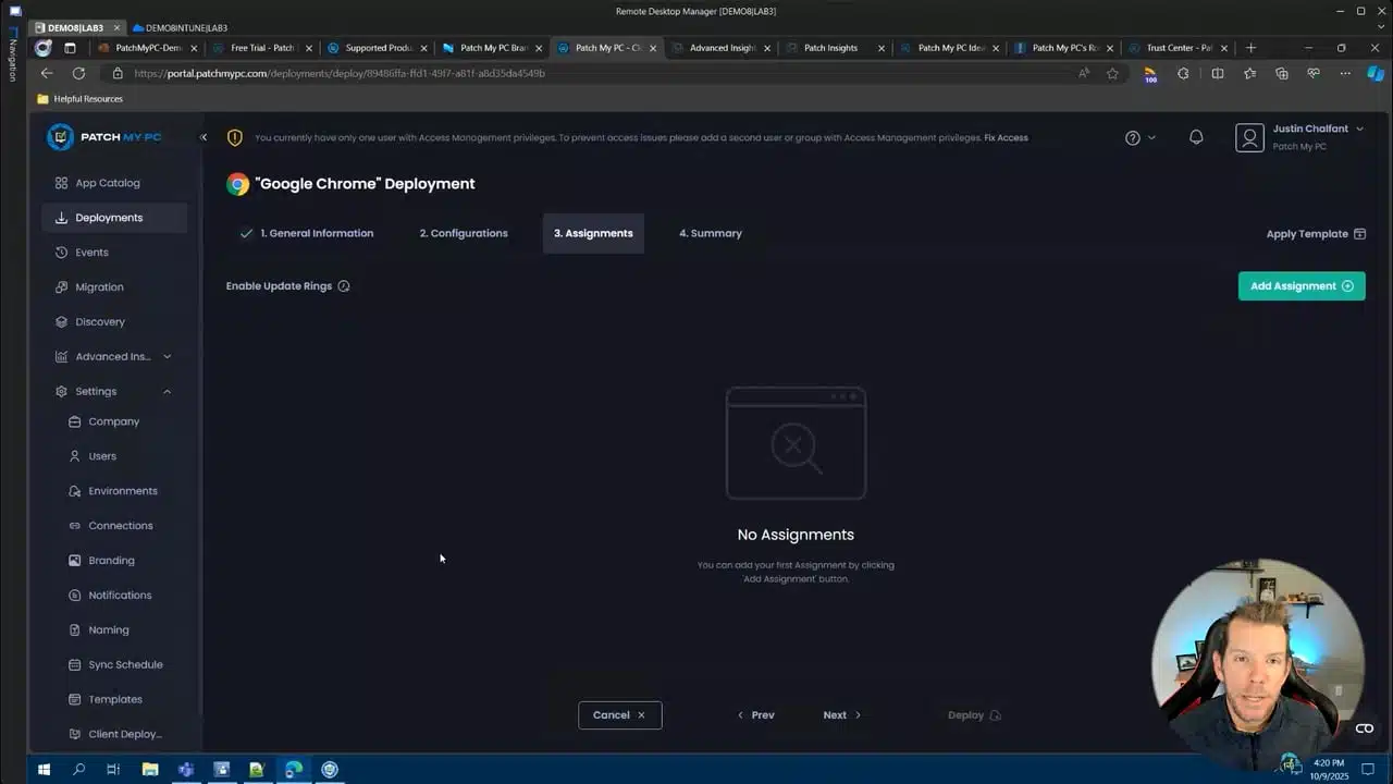 Hi, my name is Chris. I’m a customer engineer here at Patch My PC and we’re to be talking about update rings. As you’re building your deployments, you may have the need for slowly rolling these updates through your environment. So we give you the option here to enable some update rings. You can add as many rings as you want here. I’m going to go ahead and add three different rings and you can specify the delay for each of those rings. So I’m going go ahead and set up zero three and seven day delays between when we are going to add our assignments in Intune. I’m gonna go ahead and add my assignment to make this application available to my users the day that the application comes out. So that would be day zero. rnrnI’m also going to make sure that we’re testing this with our IT department first. Now, if you are currently using Windows Auto Patch or Windows Update for Business, you may already have update groups built out. You can use those exact same groups. So I’m going to go ahead and set up my IT department here. And then three days later, we’re going to make sure that I set up our broad range device group. And lastly, after seven days, we’ve done enough testing. Let’s go ahead and send it to all of our production devices. Now, update ring start time. This is important. Delayed would mean that today is day zero. rnrnSo as I’m deploying this into Intune, we’re going to only assign these assignments here, my IT department, and my all users assignment as available. So we’ll go ahead and set it up as delay. That’s why it is recommended. Setting it to immediate would ensure that we assign all of these immediately. However, we will start the update cycle the next update of Google Chrome. So let’s go ahead and set this up.rnrnNow, as this is being built, there’s a couple of things to take note here. Currently, version 141 is the latest and greatest version of Google Chrome, and we are assigning it out to all of our users as available, as well as the update. We’re only sending it to our IT department. There may be an instance where updates start to overlap each other. This is something unique to third party applications where vendors typically update their software so frequently that they might overlap the rings that you have set up. Now that’s OK. We will continue to maintain the current version, in this case version 141, through all of your update rings. And if a new version is released within that time frame, we will start a new ring one with that new version. So from the user’s perspective, all they’re really going to see is currently it’s version 141 and version 142.rnrnThey will not be skipped around as far as versions go. So in Intune, let’s go ahead and refresh this. have my Google Chrome update here and this should be assigned out to all my devices.