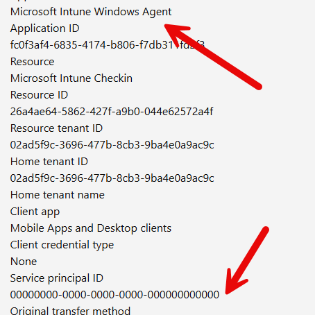 The explanation lies in how IME has been authenticating to date. The Microsoft Intune Windows Agent client ID was using service principal-less authentication. The application exists globally in Microsoft’s tenant, but no tenant-local service principal object has ever been created in this tenant.