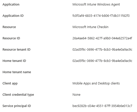 That value explicitly indicates that the sign-in occurred without a client service principal in the tenant. The IME had been authenticating successfully for years without a tenant-local service principal. That explains why apps are installed normally, why the application was invisible, and why there was no tenant-side switch that could accidentally break it. As long as the application remained service principal-less, there was nothing to enable.