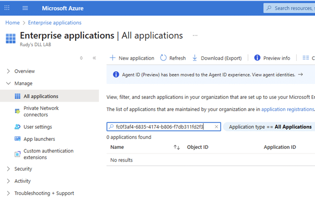 Searching for Enterprise Applications by name returned no results. Searching by application ID returned nothing. Filtering for Microsoft applications did not help. Graph queries returned empty results. PowerShell could not find anything either. The application simply did not exist in the tenant.
