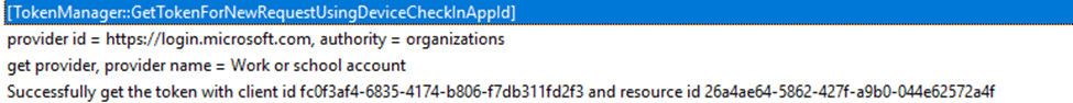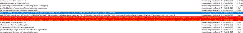 This is the point where the investigation changes direction. The Intune Management Extension does not only authenticate on behalf of the signed-in user. It also requires a token to talk with an enterprise application. That application identity is required for IME to communicate with Intune services and request processing instructions. The IME log makes this explicit by showing the client ID used during token acquisition: fc0f3af4-6835-4174-b806-f7db311fd2f3