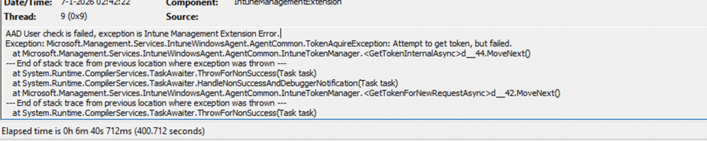 Reading through the IME log, one thing became clear very quickly. The intune management extension never reached a point where app content was evaluated. It never progressed far enough to look at detection rules or download installers. Instead, it failed at the very beginning of the required app check-in process.