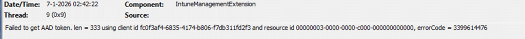 At that moment, the meaning of the error became clear. The sign-in block was not about the user. It was about the application identity IME depends on. If that identity cannot sign in, IME cannot function, regardless of how healthy the user account looks. With it, you will find the Failed to get AAD token and errorcode 3399614476.
