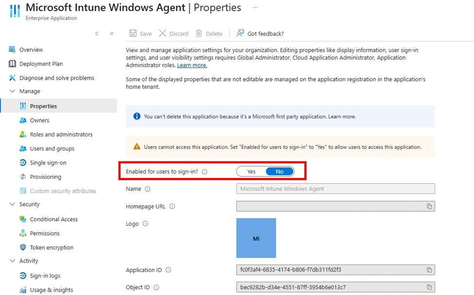 If that value is set to false, Entra blocks application sign-in. When application sign-in is blocked, IME cannot acquire a token (Failed to get AAD token 3399614476). Without a token, it cannot communicate with Intune services. Without that communication, Win32 apps never start processing. That is exactly what the IME log had been telling us from the beginning.