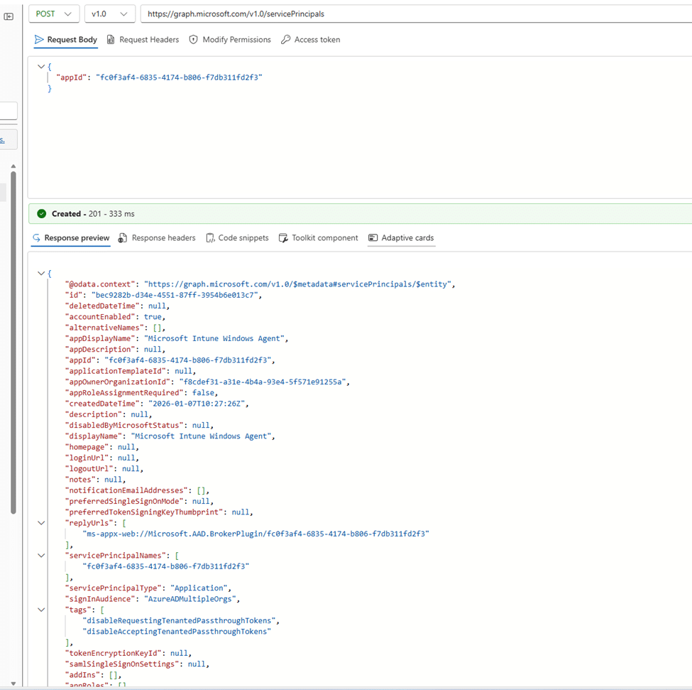 The explanation lies in how IME has been authenticating to date. The Microsoft Intune Windows Agent client ID was using service principal-less authentication. The application exists globally in Microsoft’s tenant, but no tenant-local service principal object has ever been created in this tenant.